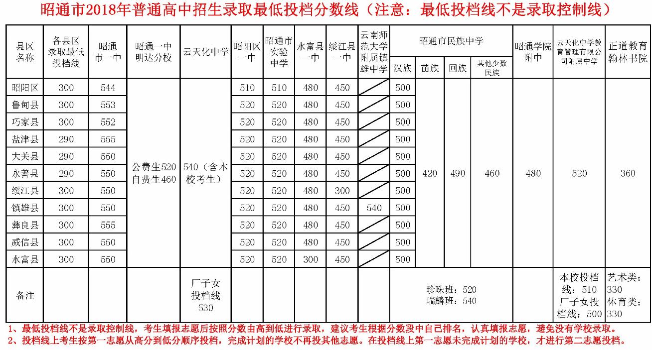 昭通市2018年普通高中招生錄取最低投檔分數(shù)線