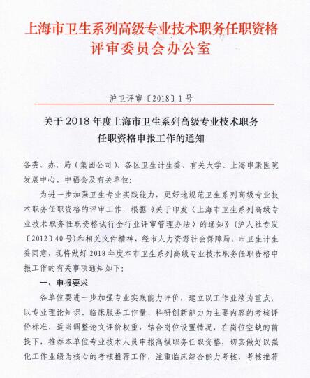 從上海衛(wèi)生人才網(wǎng)獲悉,2018上海市衛(wèi)生系列高級(jí)專業(yè)技術(shù)職務(wù)任職資格評(píng)審辦法及申報(bào)系統(tǒng)已公布,請(qǐng)按通知要求完成高級(jí)職稱申報(bào)工作,具體詳情如下: