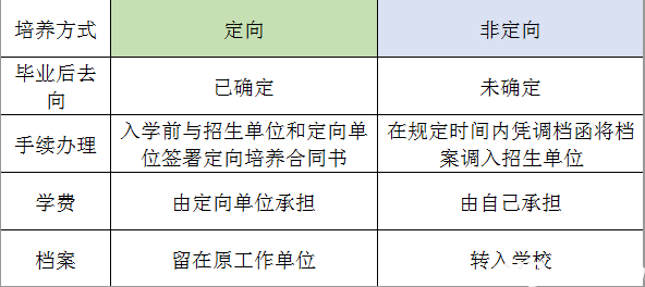 入學(xué)前就確定了工作單位,錄取前考生要與工作單位、錄取學(xué)校簽署定向培養(yǎng)協(xié)議。在讀期間檔案仍留在原工作單位,考生畢業(yè)后回原單位工作。