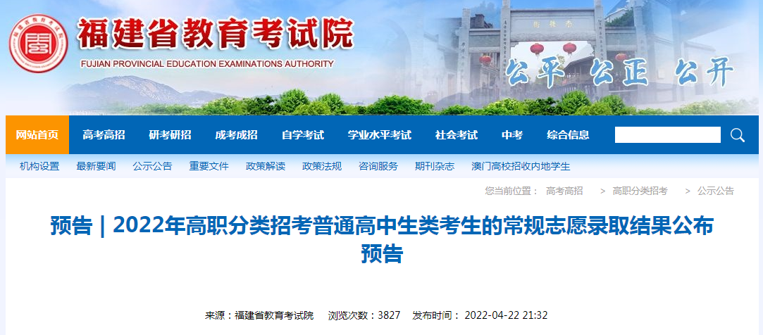 從福建省教育考試院了解到,福建2022年高職分類招考普通高中生類考生的常規(guī)志愿錄取結(jié)果預(yù)計(jì)4月24日下午3:00公布,詳細(xì)內(nèi)容如下: