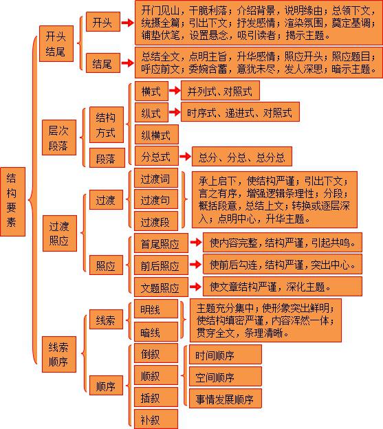 結(jié)構(gòu)是文章的骨骼和布局,是為表現(xiàn)文章內(nèi)容對材料的組織安排,是對文章形式進行的總體設(shè)計,是解決“言之有序”問題和謀篇布局的手段。好的文本要求條理清晰、層次分明、安排合理、結(jié)構(gòu)精巧、布局新穎。結(jié)構(gòu)手法屬于表達技巧之一。它通常包括照應(yīng)、鋪墊、伏筆、過渡、線索、順序、總分、開門見山、卒章顯志等。