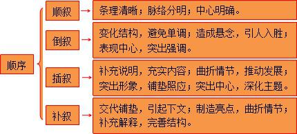 敘述方法是一種記人敘事并陳述其來龍去脈的表述方法,通常按敘述的先后順序,分為順敘、倒敘、插敘、補敘等。在文章中,不同的順序有不同的特點和作用。順序是現(xiàn)代文閱讀理解中的重要考點之一,尤其是插敘的考查頻率。