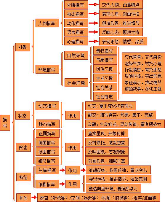 描寫就是用生動形象的語言,把人物或景物的狀態(tài)具體地描繪出來。描寫是一般記敘文和文學(xué)寫作常用的表達方法。描寫按不同分法,有不同的分類,按照敘述角度可分為直接描寫(正面描寫)、間接描寫(側(cè)面描寫)、場面描寫、細節(jié)描寫;按描寫的對象可分為人物描寫、環(huán)境描寫;按描寫特征還可分為白描、細描;按描寫的狀態(tài)可分為動態(tài)描寫和靜態(tài)描寫。還可以從感官、虛實等多角度描寫。需要指出的是,我們將人物描寫和環(huán)境描寫的所有方法統(tǒng)稱為描寫方法,狹義的描寫方法上多指人物描寫的方法;將正側(cè)、動靜、虛實、點面、感官、空間、視角等統(tǒng)稱為描寫角度,狹義上描寫角度多指正側(cè)描寫。以上這些描寫角度和方法在閱讀中都有考查。下面就以圖表的形式作以形象展示。