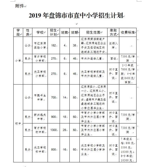 附件:2019年盤錦市市直中小學招生計劃