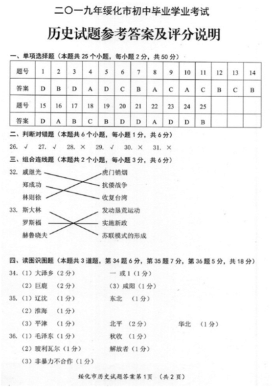 2019年黑龍江綏化中考?xì)v史考試已結(jié)束,中考頻道搜集整理發(fā)布了“2019年黑龍江綏化中考?xì)v史答案”,供考生們參考學(xué)習(xí),小編預(yù)祝大家取得優(yōu)異的成績!