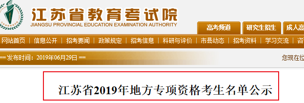 從江蘇省教育考試院獲悉,根據(jù)教育部和我省普通高校地方專項文件精神,現(xiàn)對江蘇省2019年地方專項資格考生名單予以公示。公示時間為6月25日—7月4日。如對公示對象有異議,可與江蘇省教育考試院高校招生處聯(lián)系,具體情況如下:
