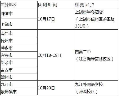 初檢時間從2019年10月17日開始至10月20日結(jié)束。檢測工作均安排在上午,08:00之前參檢學(xué)生集合完畢,可吃早餐,不用空腹。具體上站檢測的日程安排見下表:
