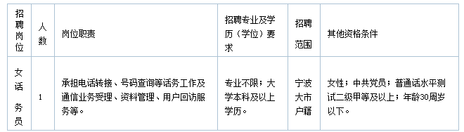 根據(jù)《寧波市事業(yè)單位公開招聘工作人員實(shí)施辦法》有關(guān)規(guī)定,經(jīng)市人力資源和社會(huì)保障局同意,寧波市專用通信局決定面向?qū)幉ù笫泄_招聘事業(yè)編制工作人員1名。現(xiàn)就有關(guān)事項(xiàng)公告如下: