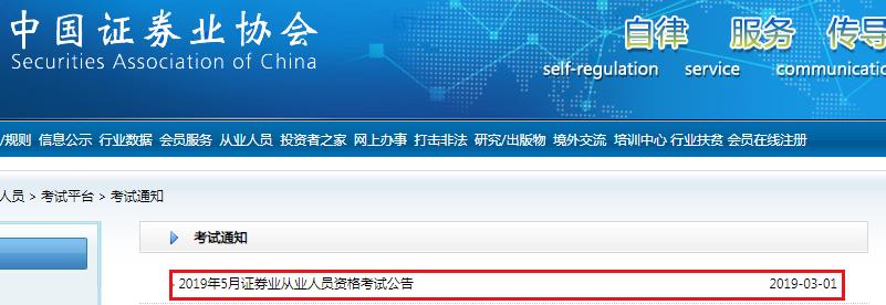 根據(jù)中國證券業(yè)協(xié)會發(fā)布的《2019年5月證券業(yè)從業(yè)人員資格考試公告》得知證券從業(yè)資格考試報(bào)名相關(guān)供大家參考,希望對考生有幫助,報(bào)名時(shí)間是有期限的請大家在規(guī)定時(shí)間內(nèi)進(jìn)行報(bào)名,切勿錯(cuò)過報(bào)名時(shí)間!