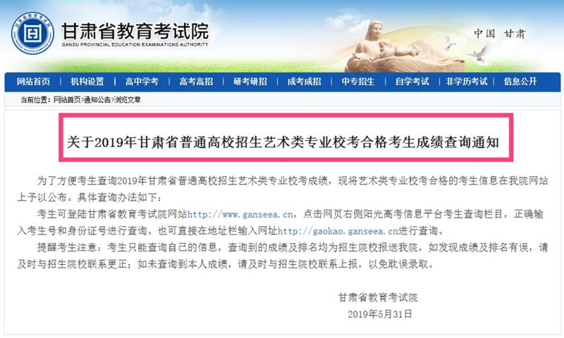 關(guān)于2019年甘肅省普通高校招生藝術(shù)類專業(yè)??己细窨忌煽儾樵兺ㄖ?BR> 為了方便考生查詢2019年甘肅省普通高校招生藝術(shù)類專業(yè)校考成績,現(xiàn)將藝術(shù)類專業(yè)??己细竦目忌畔⒃谖以壕W(wǎng)站上予以公布。具體查詢辦法如下: