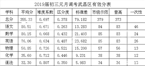 武昌區(qū)全區(qū)平均分355.33,試卷整體難度系數(shù)0.697。普高劃線373分,示范線379分。