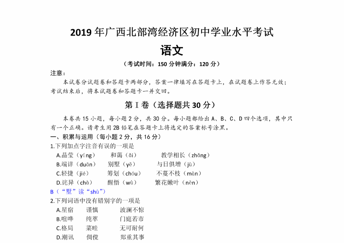 2019年廣西北海中考語(yǔ)文考試已結(jié)束,中考頻道搜集整理發(fā)布了“2019年廣西北海中考語(yǔ)文試題及答案”,供考生們參考學(xué)習(xí),小編預(yù)祝大家取得優(yōu)異的成績(jī)!