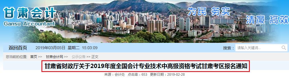 甘肅省財(cái)政廳關(guān)于2019年度全國(guó)會(huì)計(jì)專(zhuān)業(yè)技術(shù)中高級(jí)資格考試甘肅考區(qū)報(bào)名通知