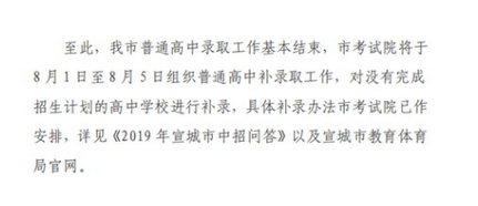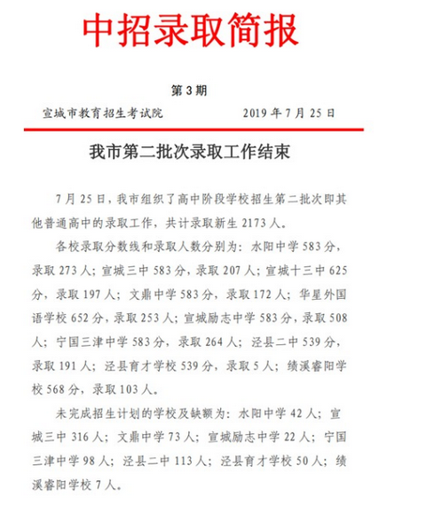 2019年安徽宣城第二批中考錄取分?jǐn)?shù)線已公布