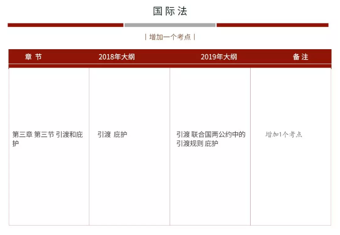 與2018年國家統(tǒng)一法律職業(yè)資格考試大綱相比,2019年的國家統(tǒng)一法律職業(yè)資格考試大綱(下稱2019年法考大綱)體例基本相同,考查知識點和附錄法律法規(guī)數(shù)量基本保持穩(wěn)定。2019年法考大綱所涉及的16個科目變化中,中國法律史、知識產(chǎn)權(quán)法兩個學(xué)科沒有變化。法理學(xué)、國際經(jīng)濟法、行政法與行政訴訟法考點數(shù)量不變。