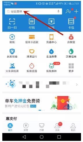 第一步:進(jìn)入手機(jī)“支付寶APP”點擊上方搜索