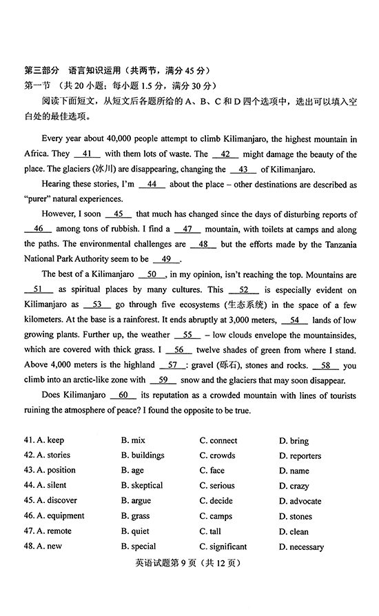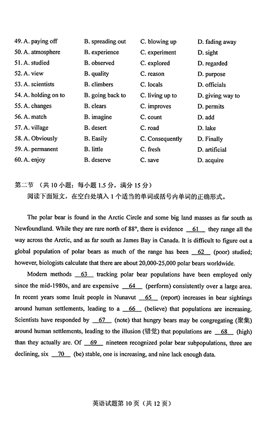 湖北高考頻道從湖 北省教育考試院了解到,2019年湖北高考英語真題已公布,湖北高考英語真題具體如下: