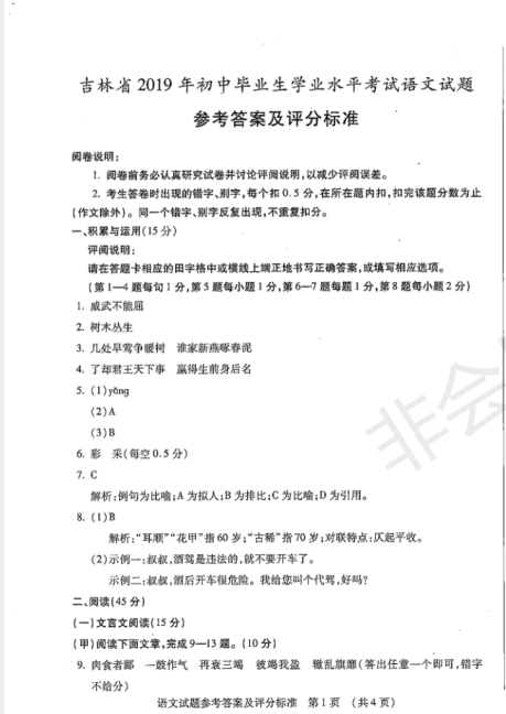 2019年吉林白山中考語(yǔ)文考試現(xiàn)已結(jié)束,為方便考生及時(shí)估分,中考頻道在本次考試結(jié)束后發(fā)布了“2019年吉林白山中考語(yǔ)文答案”僅供考生參考學(xué)習(xí),在此預(yù)祝廣大考生取得優(yōu)異的成績(jī),請(qǐng)繼續(xù)關(guān)注我們!