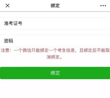 3.點(diǎn)擊“綁定微信”按鈕后進(jìn)入以下界面。輸入你要綁定的考生對應(yīng)的準(zhǔn)考證號和密碼(密碼為準(zhǔn)考證上的“志愿填報密碼”),輸入后點(diǎn)擊“綁定”