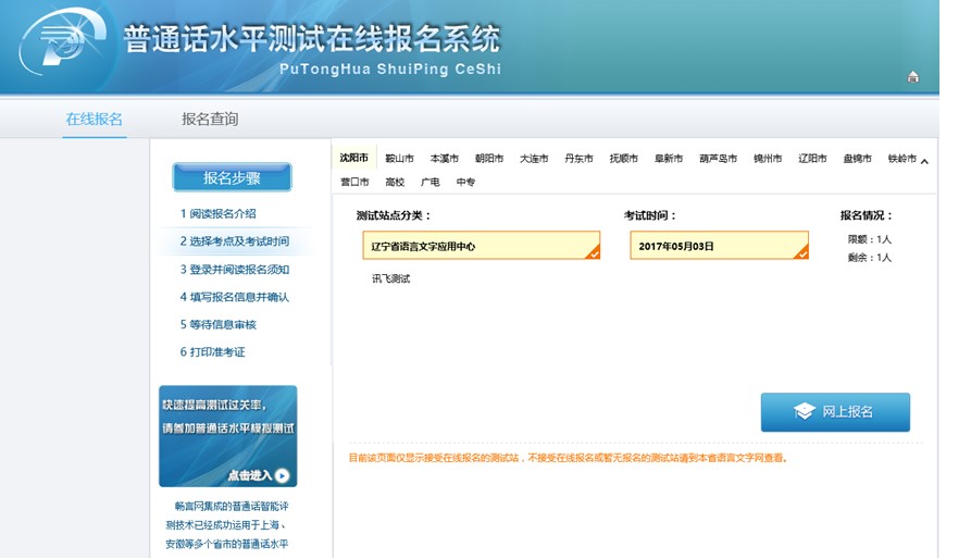 遼寧省語言文字應(yīng)用中心測試站接受以下5類應(yīng)試者通過網(wǎng)上報名,經(jīng)現(xiàn)場資格審查,報名合格的應(yīng)試者參加測試,不符合條件的應(yīng)試者取消報名;管理系統(tǒng)不接受3個月內(nèi)在遼寧省各普通話水平測試站的重復(fù)報名。