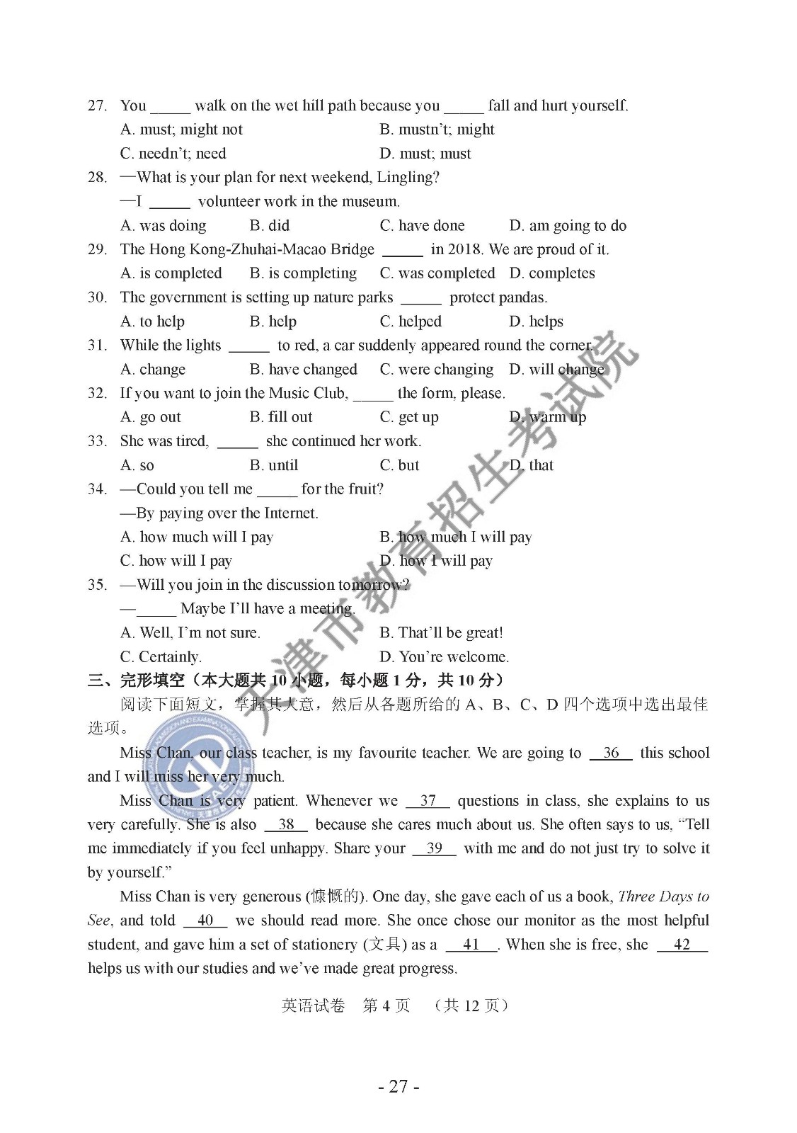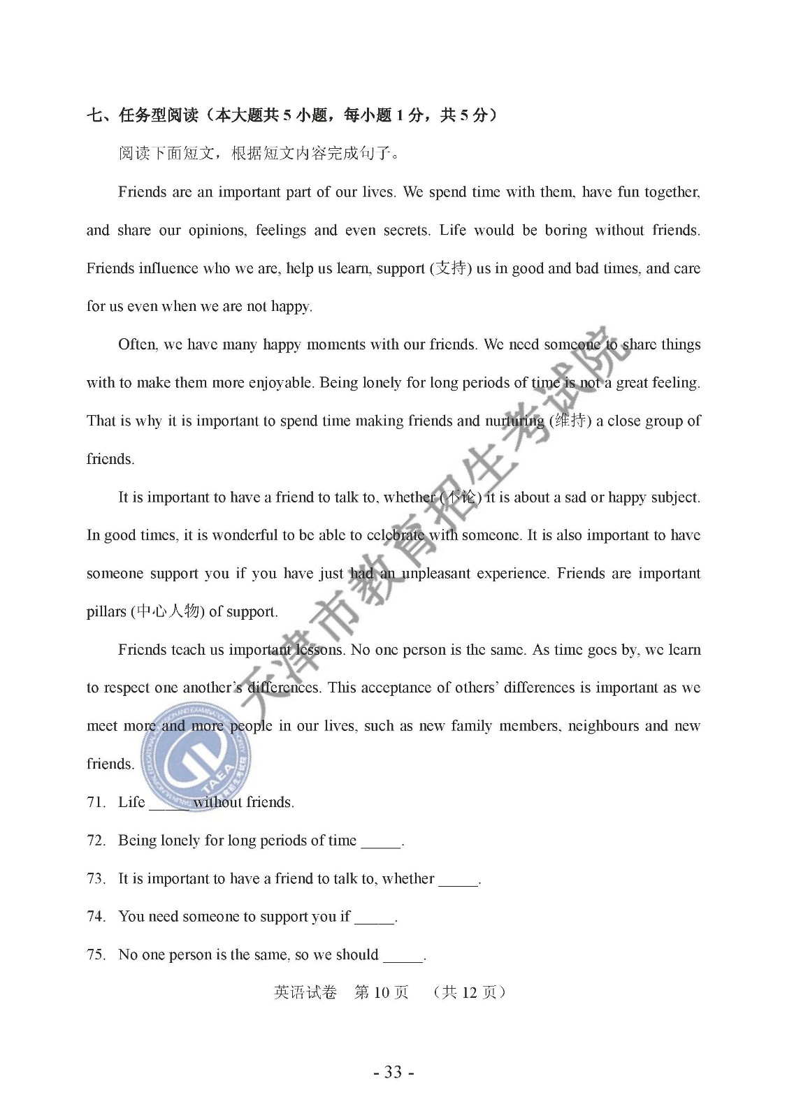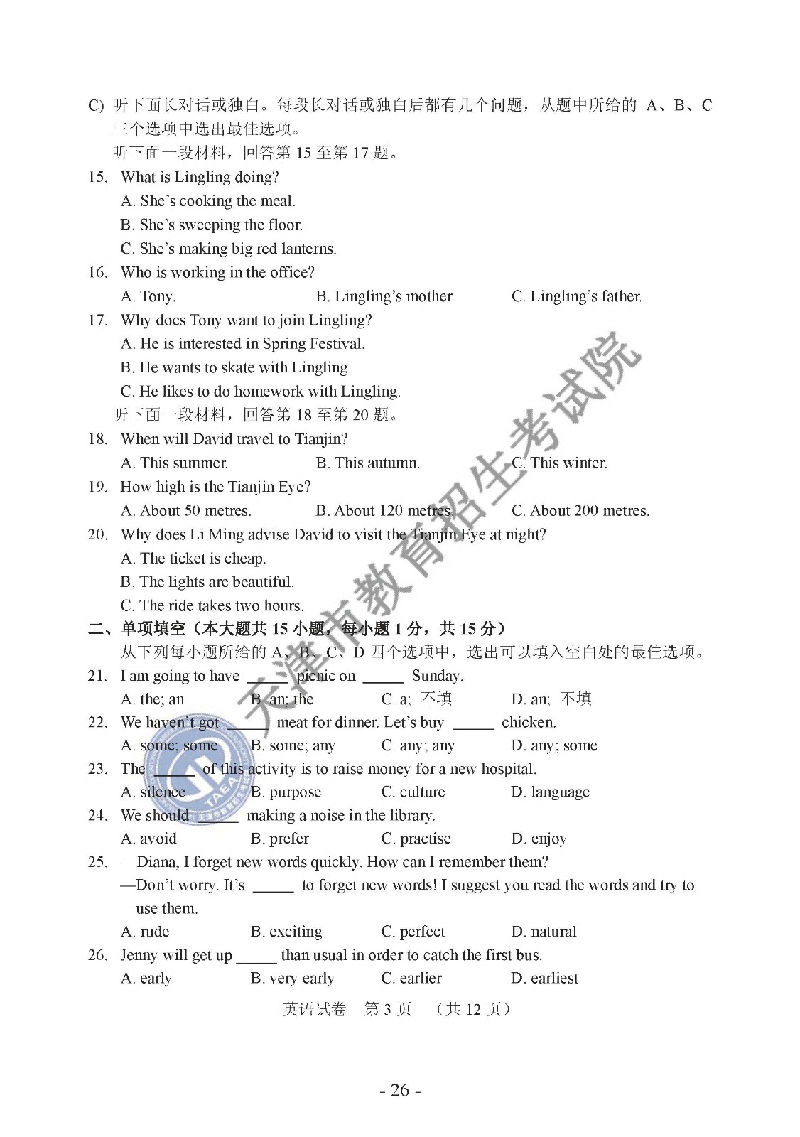 2019年天津市初中畢業(yè)生學(xué)業(yè)考試已于6月15日、16日順利結(jié)束,天津市教育招生考試院現(xiàn)發(fā)布各科目試卷及參考答案,中考頻道已將“2019年天津河?xùn)|中考英語試題”整理如下,供考生們供參考使用,小編預(yù)祝大家取得優(yōu)異的成績!