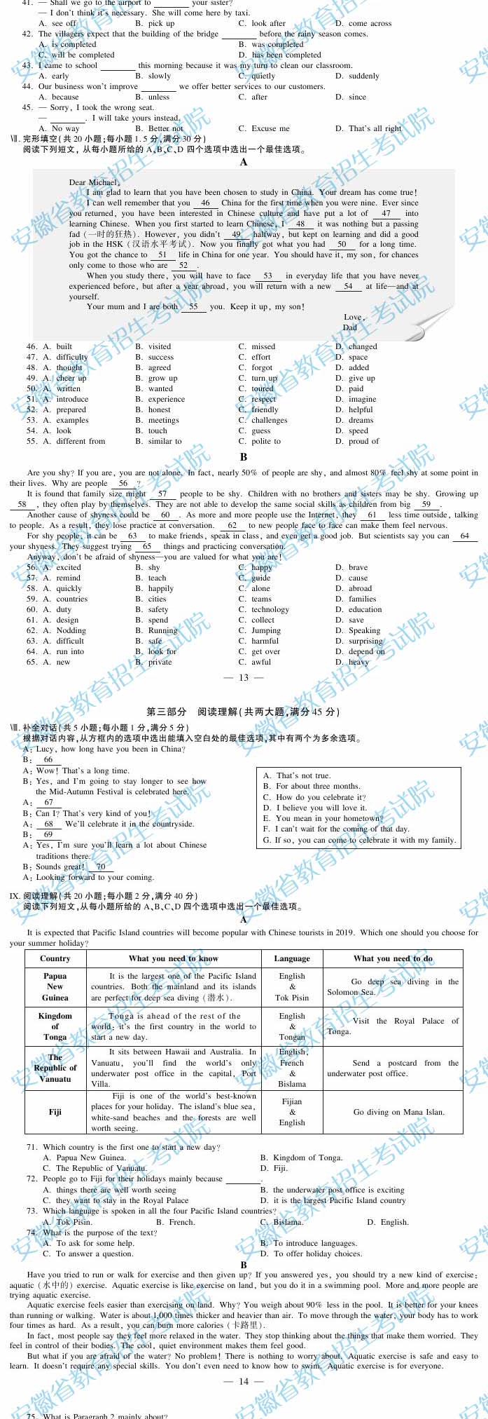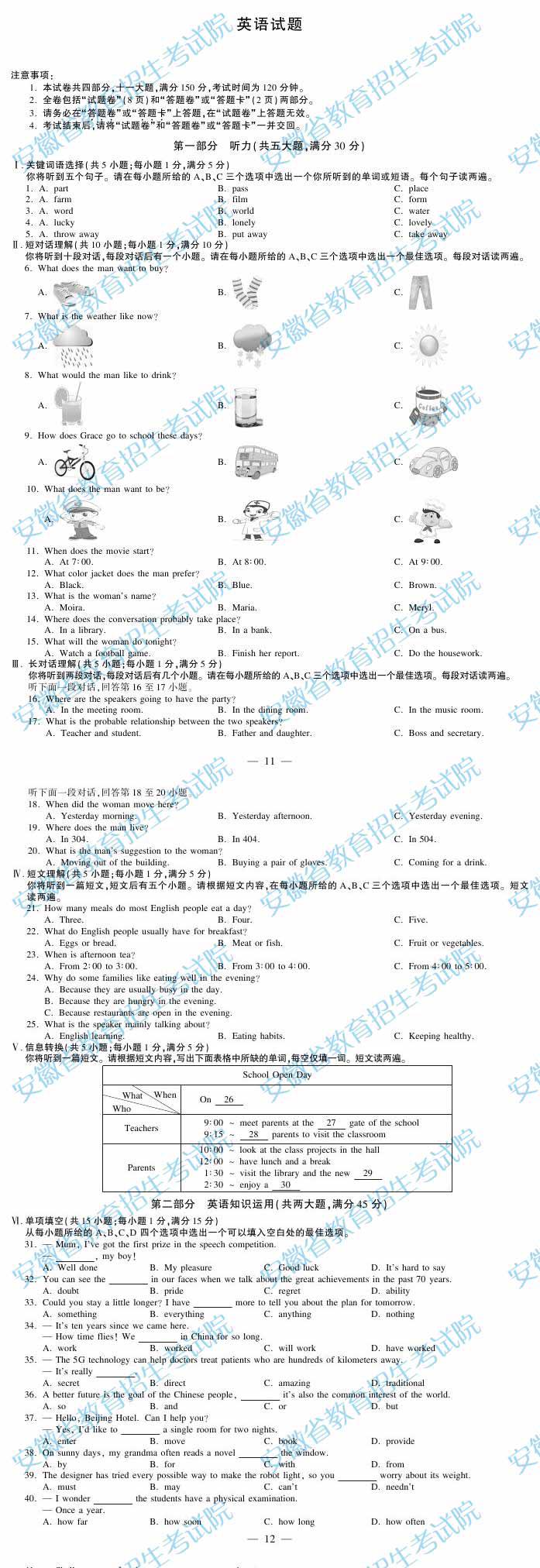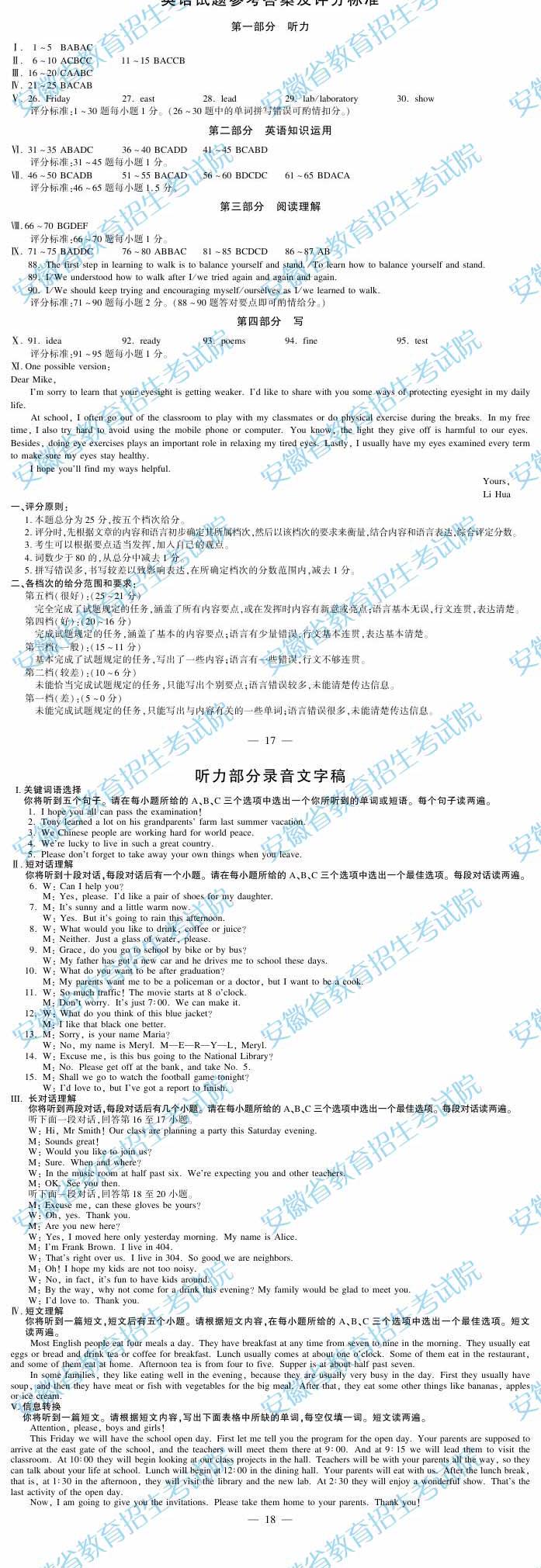 2019年安徽合肥初中畢業(yè)生學(xué)業(yè)考試已于6月16日順利結(jié)束,安徽省教育招生考試院現(xiàn)發(fā)布了各科目2019年安徽合肥省初中學(xué)業(yè)水平考試試題、參考答案及評(píng)分標(biāo)準(zhǔn),中考頻道已將“2019年安徽合肥中考英語(yǔ)試卷及答案”整理如下,供考生們供參考使用,小編預(yù)祝大家取得優(yōu)異的成績(jī)!