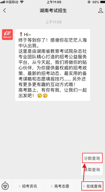 點擊進入:2019年湖南高考成績查詢?nèi)肟谌?BR> 2、微 信查詢: