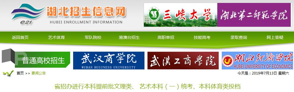 從湖北招生信息網(wǎng)獲悉,2019湖北省招辦進(jìn)行本科提前批文理類、藝術(shù)本科(一)統(tǒng)考、本科體育類投檔,詳情如下: