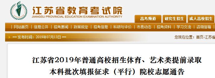 從江蘇省教育考試院獲悉,2019江蘇普通高校招生體育、藝術(shù)類提前錄取本科批次填報(bào)征求(平行)院校志愿通告已公布,詳情如下: