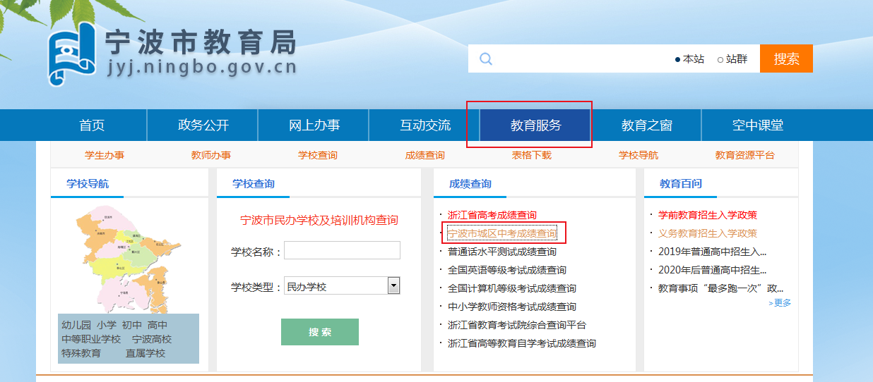 考生可通過“寧波教育”“寧波教育考試”微 信公眾號(hào)查詢城區(qū)中考成績(jī)(指海曙、鄞州、江北、東錢湖、國家高新區(qū))。