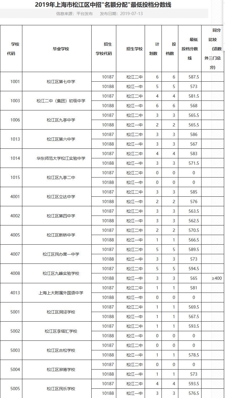 2019年上海松江區(qū)配額生中考錄取分?jǐn)?shù)線已發(fā)布