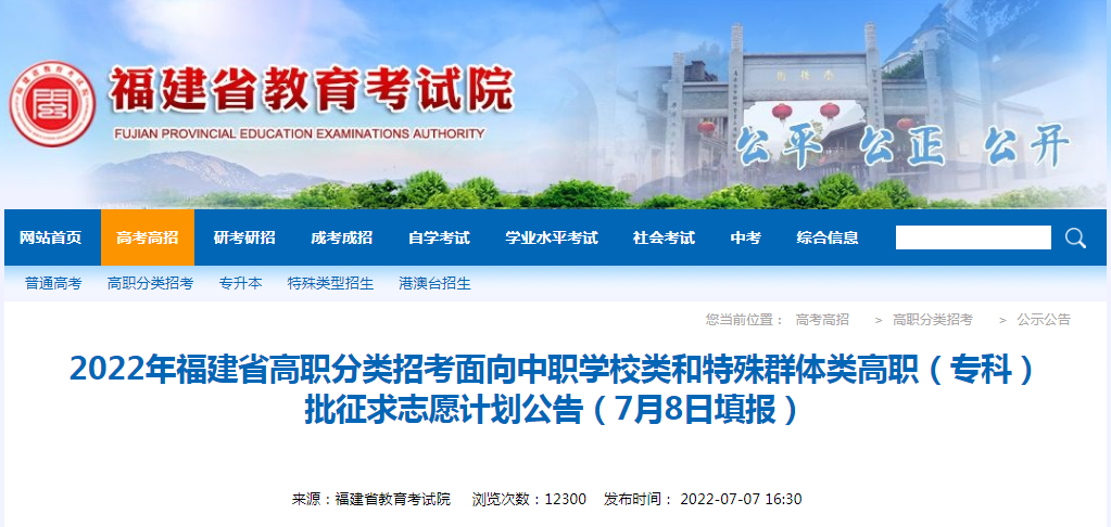 從福建省教育考試院了解到,2022年福建高職分類招考面向中職學(xué)校類和特殊群體類高職(專科)批征求志愿計劃公告已發(fā)布,詳細(xì)內(nèi)容如下: