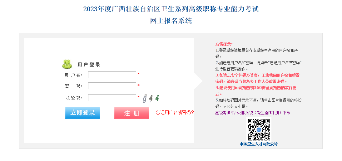 點擊進入>>>2023年廣西衛(wèi)生系列高級職稱專業(yè)能力報名繳費入口【已開通】