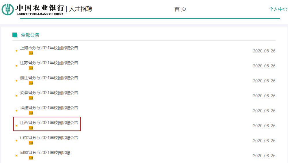 《2021年農(nóng)業(yè)銀行江西省分行校園招聘公告【500人】》已發(fā)布,報名時間:2020年9月25日(周五)24:00截止,現(xiàn)將相關(guān)信息發(fā)布如下: