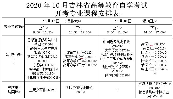 吉林市自學(xué)考試頻道根據(jù)吉林省教育考試院公布的《關(guān)于公布2020年10月吉林省高等教育自學(xué)考試課程安排的通知》了解到,2020年10月吉林吉林市自考時(shí)間已公布,吉林吉林市自考安排在10月17至18日兩天進(jìn)行。具體如下: