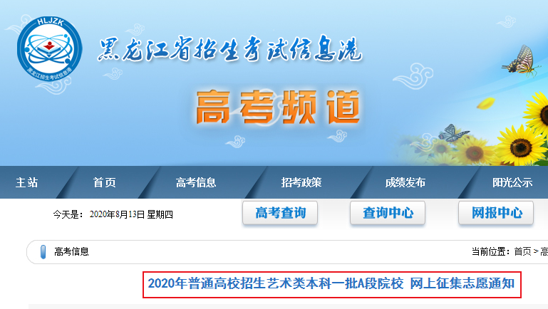 從黑龍江省招生考試信息港了解的,2020年黑龍江普通高校招生藝術(shù)類本科一批A段院校網(wǎng)上征集志愿時間為8月13日16時起至8月13日20時止,過時一律不予受理。詳細內(nèi)容如下: