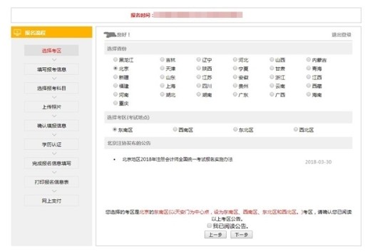 每個(gè)省份都有區(qū)域選擇,是根據(jù)住宅所在地來選擇區(qū)域,以方便中注協(xié)將考生分配到離家較近的考場(chǎng)。之后記得把下邊的"我已閱讀公告"勾上。