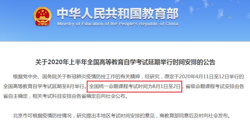 甘肅自學(xué)考試頻道根據(jù)教育部公布的《關(guān)于2020年上半年全國(guó)高等教育自學(xué)考試延期舉行時(shí)間安排的公告》了解到,2020年4月甘肅自考時(shí)間已確定,甘肅自學(xué)考試時(shí)間延期至2020年8月1日至2日舉行,具體如下:
