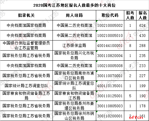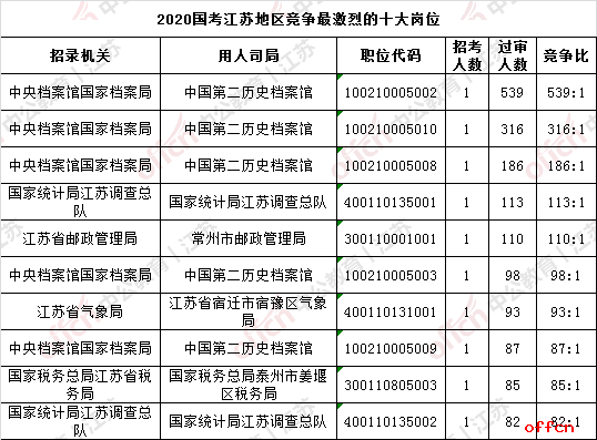 2020國考報(bào)名已經(jīng)進(jìn)入第三天,截止到10月17日下午16時,2020國考江蘇地區(qū)報(bào)名人數(shù)為:10308人,過審人數(shù)為:6459人,無人報(bào)考崗位:79個,競爭比:539:1,5崗位競爭破百。