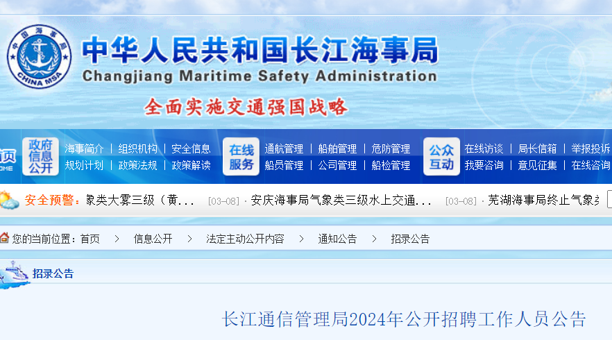 小編根據(jù)中華人民共和國(guó)長(zhǎng)江海事局發(fā)布”長(zhǎng)江通信管理局2024年公開招聘工作人員公告“得知,2024長(zhǎng)江通信管理局招聘20人,報(bào)名時(shí)間2024年3月11日至3月24日。