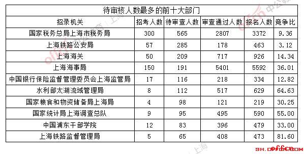 從上圖可以看出審查通過人數(shù)排名第一和第二的,同時也“招錄大戶”上海海事局和國家稅務(wù)總局上海市稅務(wù)局。但是就目前情況來說,這兩個單位的競爭比并不算高。