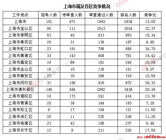 就目前來看,上海16個區(qū),總體競爭比,排名前三的區(qū)分別是:虹口區(qū)(34.7)、寶山區(qū)(32.37)、閔行區(qū)(26.32)。就這三個區(qū)而言,通過審核速度相對較快,其待審查人數(shù)都在200人以下,其中寶山區(qū)待審查人數(shù)比較接近100人。目前,各區(qū)中招錄人數(shù)最多的浦東新區(qū),其競爭比目前還在20:1,但是之后還會有上升的趨勢。