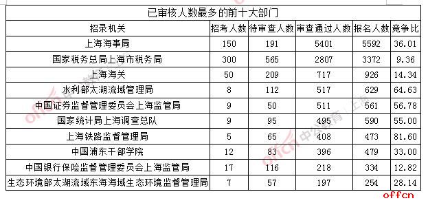 從上圖可以看出,待審查人數(shù)排名前三的分別為:國家稅務(wù)總局上海市稅務(wù)局、上海鐵路公安局和上海海關(guān)。招錄人數(shù)和已審核通過人數(shù)較多的上海海事局并不在列。從上表數(shù)據(jù)來看,目前排名前三的單位,其競爭比還處于較低位置,一方面預(yù)示審核速度相對較慢,另一方面則預(yù)示著在進入報名后半場,報名人數(shù)快速增加之后,預(yù)計這三個崗位的競爭比將會進一步上升。