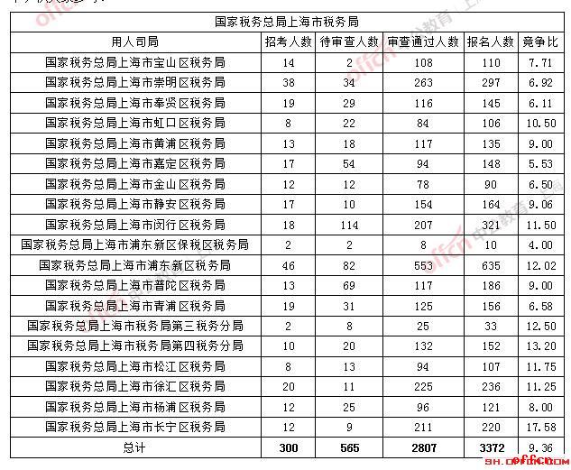 國家稅務(wù)總局上海市稅務(wù)局目前報名人數(shù)為3372,通過審核人數(shù)為2807,待審查人數(shù)為565,平均競爭比為9.36。國家稅務(wù)總局上海市稅務(wù)局各不同用人單位的具體競爭情況如下,供大家參考: