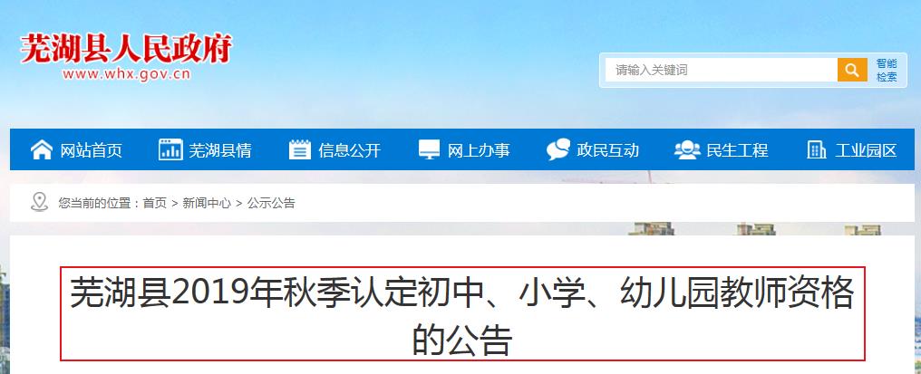 從蕪湖縣人民政府獲悉,2019秋季安徽蕪湖市蕪湖縣認(rèn)定初中、小學(xué)、幼兒園教師資格公告已公布,報(bào)名時(shí)間為10月24日至11月1日,具體詳情如下: