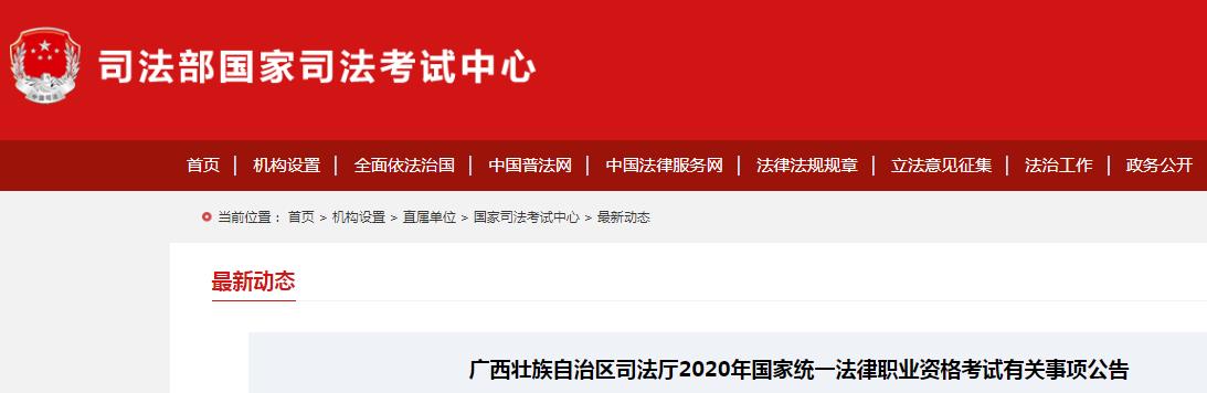 根據(jù)《中華人民共和國(guó)司法部公告》(2020年第5號(hào)),2020年國(guó)家統(tǒng)一法律職業(yè)資格考試客觀題考試時(shí)間為10月31日、11月1日,主觀題考試時(shí)間為11月28日?,F(xiàn)就廣西壯族自治區(qū)組織實(shí)施2020年國(guó)家統(tǒng)一法律職業(yè)資格考試有關(guān)事項(xiàng)公告如下。
