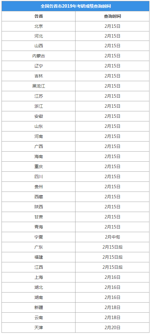 別著急,跟著小編一起來看看2019年各省市考研成績查詢時(shí)間,去年幾乎都是同一天,所以2020年考研成績查詢時(shí)間不出意外的話,也就在2月11日左右啦!大家可以過個(gè)好年咯!
