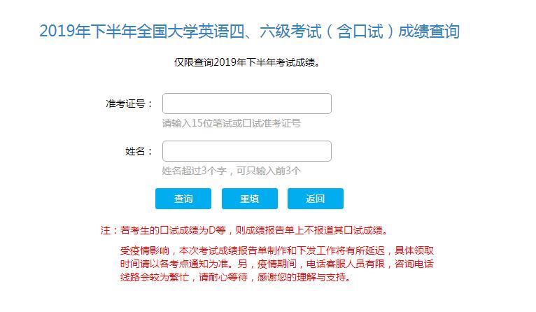 2019年12月吉林CET4成績(jī)于2020年2月21日上午10時(shí)起正式公布,考生可直接登錄中國(guó)教育考試網(wǎng)(http://cet.neea.edu.cn/cet)或中國(guó)高等教育學(xué)生信息網(wǎng)(http://www.chsi.com.cn/cet)進(jìn)行查分,若考生的口試成績(jī)?yōu)镈等,則成績(jī)報(bào)告單上不報(bào)道其口試成績(jī)。受疫情影響,本次考試成績(jī)報(bào)告單制作和下發(fā)工作將有所延遲,具體領(lǐng)取時(shí)間請(qǐng)以各考點(diǎn)通知為準(zhǔn)。另,疫情期間,電話客服人員有限,咨詢電話線路會(huì)較為繁忙,請(qǐng)耐心等待,感謝您的理解與支持。