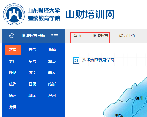 1、進(jìn)入山財培訓(xùn)網(wǎng)首頁,在導(dǎo)航欄中點擊“繼續(xù)教育”,如圖1所示。