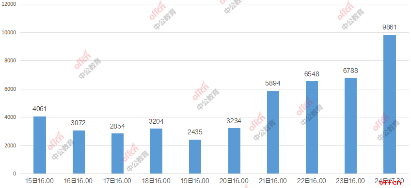 從每日新增報名人數(shù)可以看出,報名最后一天的新增報名人數(shù)最多,單日新增報名9861人。